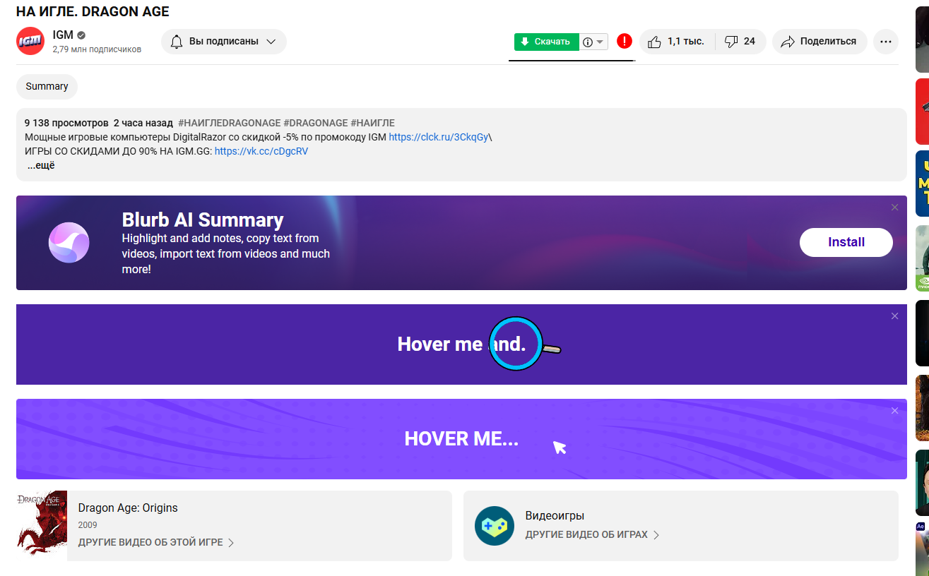 Всем привет. Раньше пользовался расширением SaveFromNet для скачивания видео с ютуба. Спустя время оно работать у меня перестало да и надобность отпала. А потом вроде вообще удалил. Сейчас же мне каждый раз при запуске компа и включении ютуба вылазит такое окно (фото 1). Его закрыл и ок. Но еще на каждом видео появилось в углу Summary, которое при нажатии что-то просит установить. Скрин не могу сделать, вчера заблочил адгардом. Это тоже блочил, но с этим не помогает. При установке SaveFromNet надо было установить Tampermonkey (тоже расширение). Когда гуглил проблему, все писали, что это из-за него. Но я не могу их удалить, так как у меня нет этих расширений уже - давно снес. Но почему-то оно все равно отображается под ютубом (есть кнопка для скачивания, хоть ничего и не работает).