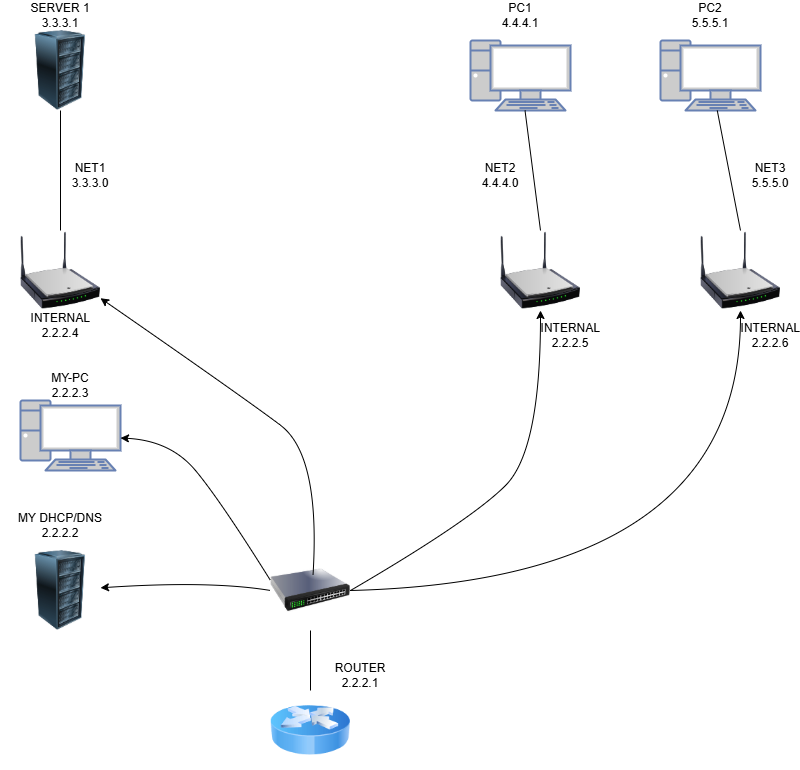 Есть несколько сетей. Условно корневая NET0 (2.2.2.0), в который стоит WinServer, на котором подняты AD,DNS,DHCP. Шлюз 2.2.2.1 ведёт в интернет. На корневом роутере прописана маршрутизация в сети NET1/2/3 К корневой зоне подключаются несколько роутеров с адресами wan портов в 2.2.2.0. Каждый роутер создаёт свою сетку (Net1\2\3), каждый роутер является своим dhcp/dns. Правилом на роутере разрешен трафик из 2.2.2.0 (Действие: Разрешить / протокол:IP / источник: сеть 2.2.2.0/24 /назначение: любое / порт: любой) :пинг/fileshare и прочее проходит, но только по IP. А хотелось бы по имени узла. хотелось бы заставить роутеры выгружать информацию о DNS в своих подсетках на DNS сервер (т.е. я сидя в корневой зоне не парясь пишу, к примеру, ping PC2 и получаю ответ, а не то, что узел не найден). Есть какой-то механизм, который может мне помочь с этим? |