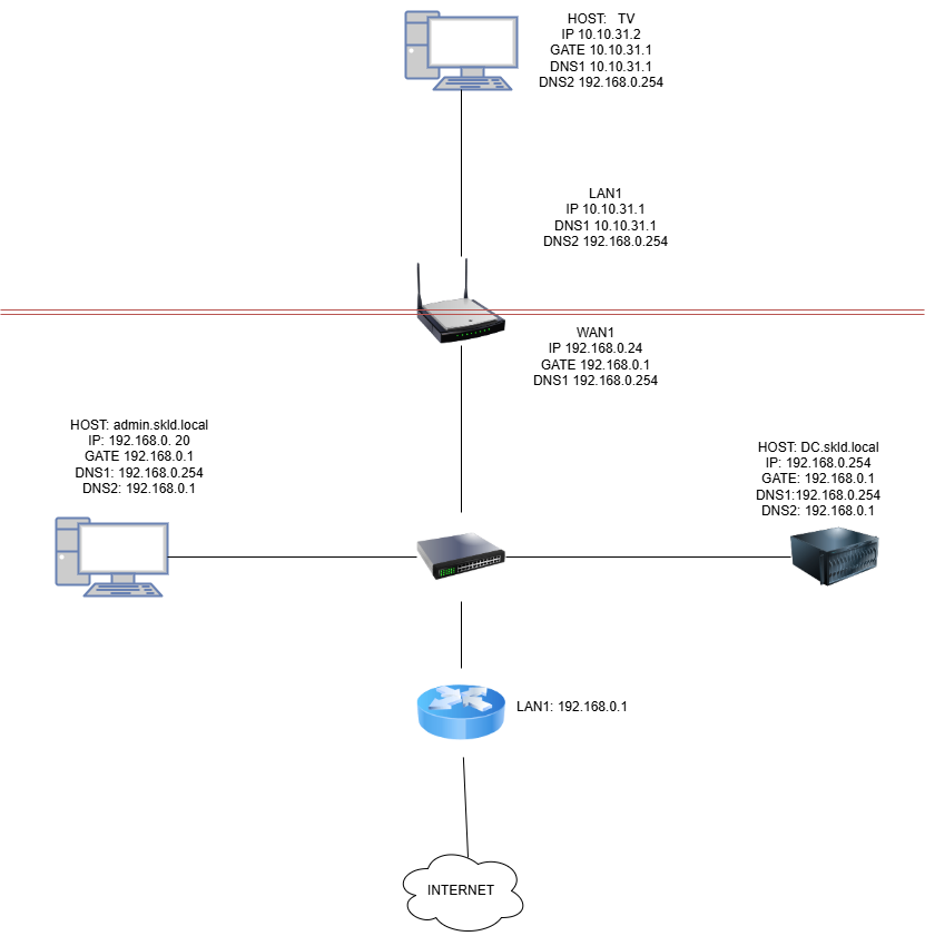 Была переделана адресация на сегменте подсети. Схема приведена в следующий вид (см. вложение) Теперь по тестам и пингам: пинг с ADMIN и с DC на TV : не удалось обнаружить узел TV пинг с ADMIN на 10.10.31.2: проходит пинг с TV на ADMIN: не удалось обнаружить узел ADMIN пинг с TV на admin.skld.local: проходит. настройки DNS на DC.skld.local Зоны прямого просмотра: основная skld.local Зоны обратного просмотра: 0.168.192.in-addr.arpa У меня по прежнему стойкое ощущение что я что-то делаю не так. UP: Поставил в сегмент skld.local еще один комп PC2, не вводил его в домен (оставил в WORKGROUP). Дал ему следующие настройки: IP 192.168.0.19 Gate 192.168.0.1 DNS1: 192.168.0.254 DNS2: 192.168.0.1 Результаты пингов у него пинг с DC.skld.local на PC2 : проходит пинг с PC2 на TV : не удалось обнаружить узел TV пинг с PC2 на 10.10.31.2: проходит пинг с TV на PC2: не удалось обнаружить узел PC2 пинг с TV на PC2.skld.local: не удалось обнаружить узел PC2 |