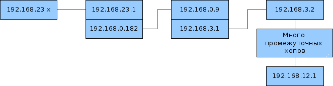 Есть машина 192.168.23.x в сети 192.168.23.0/24. Есть роутер (debian) с интерфейсами 192.168.23.1 и 192.168.0.182 (192.168.0.0/24). В нулевой сети стоит ещё один роутер на w2k с интерфейсами 192.168.0.9 и 192.168.3.1 (192.168.3.0/24, default gw 192.168.3.2).