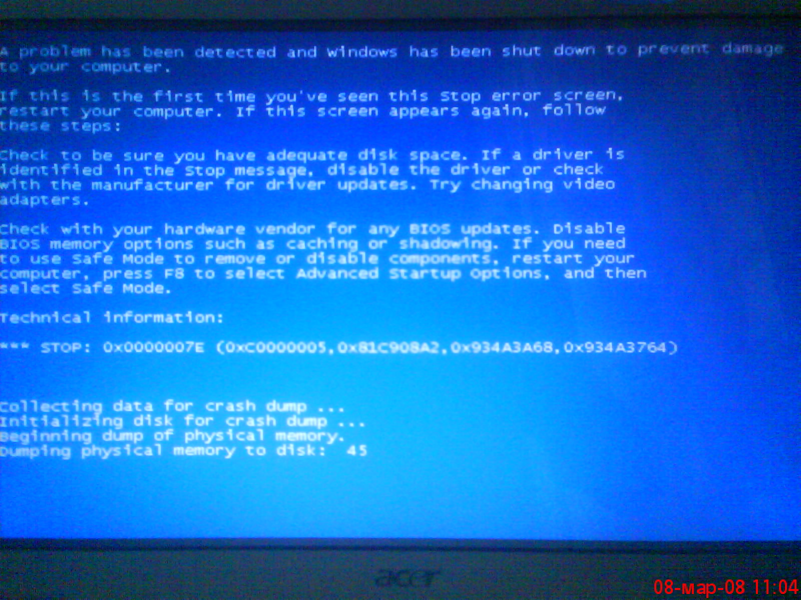 Купил ноут Acer Aspire 5920G Сегодня второй день пошёл и вот вылетела такая херь(прикреплена) в конце: Dumping physical memory to disk:100 Physical memory dump complete Обратитесь к своему системному администратору. Делал проверку-ошибок необнаружено Через Безопасный режим тоже самое происходит-появляется синий экран,перезагрузка. подскажите что и как попробовать сделать,поподробнее(я нешарю в компах) |
