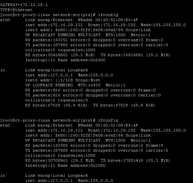eth0 Link encap:Ethernet HWaddr 00:0E:04:B7:2E:4B inet addr:192.168.**.4 Bcast:192.168.29.255 Mask:255.255.255.0 inet6 addr: fe80::20e:4ff:feb7:2e4b/64 Scope:Link UP BROADCAST RUNNING MULTICAST MTU:1500 Metric:1 RX packets:1695545 errors:0 dropped:0 overruns:0 frame:0 TX packets:40408 errors:0 dropped:0 overruns:0 carrier:0 collisions:0 txqueuelen:100 RX bytes:213286159 (203.4 MiB) TX bytes:7039599 (6.7 MiB) Base address:0xe800 Memory:fbbe0000-fbc00000 eth2 Link encap:Ethernet HWaddr 00:08:C7:45:16:57 inet addr:172.16.*.1 Bcast:172.16.5.255 Mask:255.255.255.0 inet6 addr: fe80::208:c7ff:fe45:1657/64 Scope:Link UP BROADCAST RUNNING MULTICAST MTU:1500 Metric:1 RX packets:1680975 errors:0 dropped:0 overruns:0 frame:0 TX packets:54993 errors:0 dropped:0 overruns:0 carrier:0 collisions:0 txqueuelen:1000 RX bytes:157736622 (150.4 MiB) TX bytes:62827698 (59.9 MiB) eth3 Link encap:Ethernet HWaddr 00:23:54:C7:9C:B3 inet addr:192.168.100.11 Bcast:192.168.100.255 Mask:255.255.255.0 UP BROADCAST MULTICAST MTU:1500 Metric:1 RX packets:0 errors:0 dropped:2539893268 overruns:0 frame:0 TX packets:0 errors:0 dropped:0 overruns:0 carrier:0 collisions:0 txqueuelen:1000 RX bytes:0 (0.0 b) TX bytes:0 (0.0 b) Interrupt:58 Base address:0xc000 lo Link encap:Local Loopback inet addr:127.0.0.1 Mask:255.0.0.0 inet6 addr: ::1/128 Scope:Host UP LOOPBACK RUNNING MTU:16436 Metric:1 RX packets:61 errors:0 dropped:0 overruns:0 frame:0 TX packets:61 errors:0 dropped:0 overruns:0 carrier:0 collisions:0 txqueuelen:0 RX bytes:5152 (5.0 KiB) TX bytes:5152 (5.0 KiB) все работает, но после ребоота все слетает и инета нету ![]() мне сказали что надо стартаповски файл писать со всеми настройками, и он при загрузке будет их прописывать, но как их делать я незнаю. Подскажите пожалуйста как? заранее спасибо |