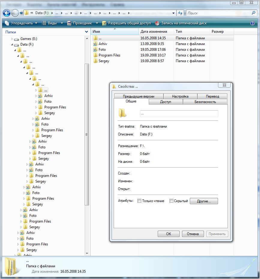 Помогите разобраться с таким вопросом... Вот ни с того, ни с сего однажды в корне диска С появилась папка с названием "..." Да, вот так вот она и называется. Она в себе содержит тот же диск С с самой собой и так до бесконечности. Соответственно, при удалении, она предупреждает, что удаляет важные файлы и тут главное успеть сказать Нет. Спустя пару недель такое же чудо появилось на втором диске D. По свойствам - весит 0, содержит 0. Скриншоты прилагаю. Что жто за цикл такой, как с ним разобраться и убрать, отключить? Очень не люблю, когда что-то появляется из ничего, являет собой бесконечность и нагло остается без возможности изменений...