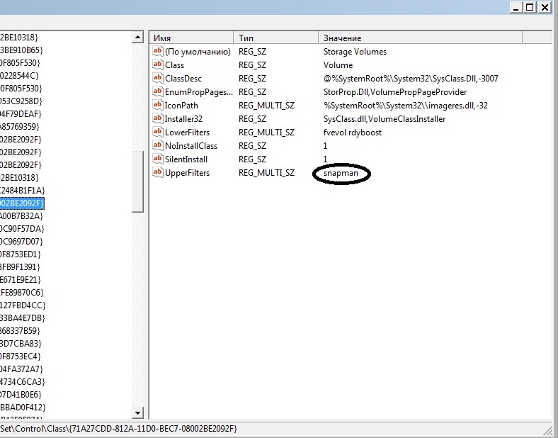 Воспользовался утлиткой, все выполнил. Пошел проверять реестр (как написано в инструкции) HKEY_LOCAL_MACHINE \ SYSTEM \ CurrentControlSet \ Control \ Class \ {71A27CDD-812A-11D0-BEC7-08002BE2092F} Там нашел файл UpperFilters в его значении написано snapman , как я понял его надо удалить. Собственно каким образом? Просто стереть или где то что то менять? или заменить на что то другое? |