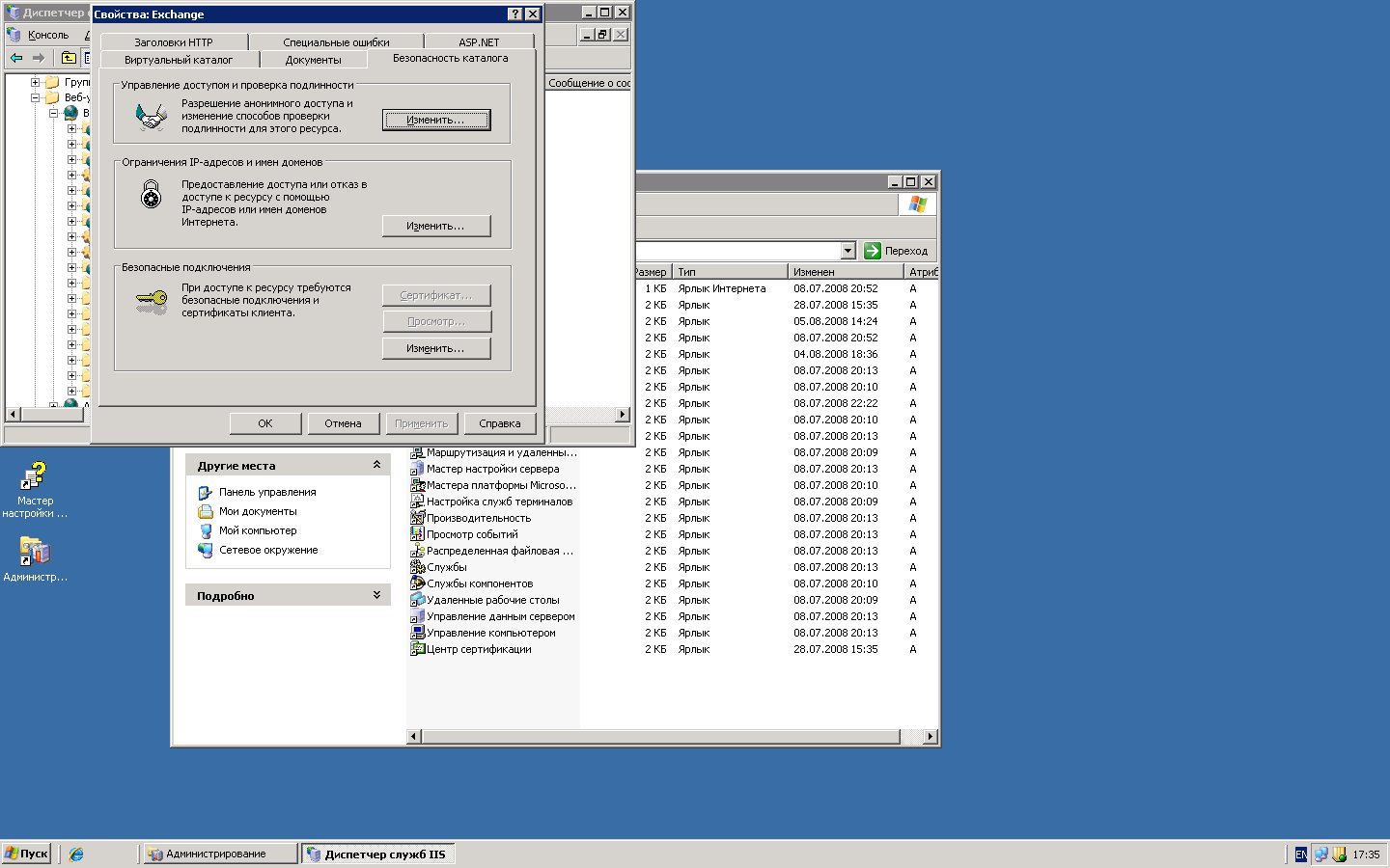 Вопрос - как сделать сертификат для SSL подключения?Я захожу в свойства Exchange в IIS - веб узлы по умолчанию - далее в безопасность каталога, но вкладка сертификат - серая - недоступная.
