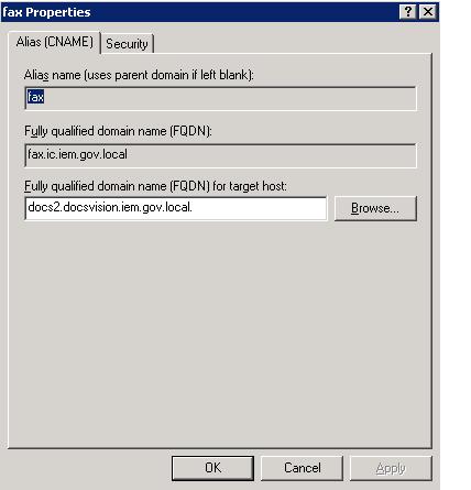 2. Доступ на ДНС имя докс2 (его алиас и есть FAX) происходит без проблем 3. D:\>ping docs2 Pinging docs2.docsvision.iem.gov.local [10.12.10.211] with 32 bytes of data: Reply from 10.12.10.211: bytes=32 time<1ms TTL=128 ..... D:\>ping fax Pinging docs2.docsvision.iem.gov.local [10.12.10.211] with 32 bytes of data: Reply from 10.12.10.211: bytes=32 time<1ms TTL=128 4. По первому скрину FQDN образуется автоматически, я указал только имя алиаса, а все остальное - это имя домена |