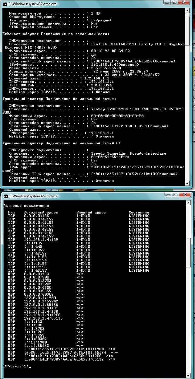 потом выложи команды ipconfig /all и netstat -ab (b забыл тогда добавить). еще фишка на будущее - чтобы вывод консоли в файл перегнать надо например ipconfig /all > c:\ipconfig.txt ну или любое другое место и название после > |