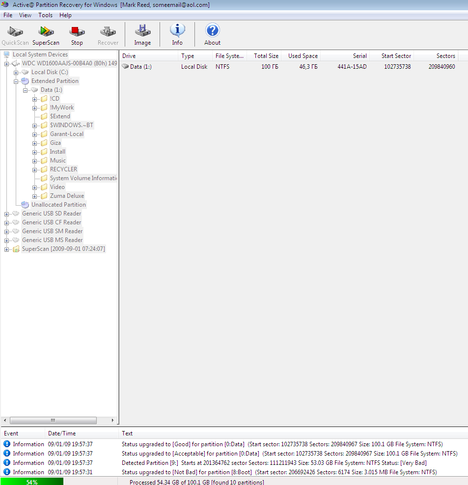 При этом В7 не видит второй раздел диска (дополнительный), на котором у меня вся информация хранится. Захожу в управление дисками он показывает основной раздел нормально (размер, файловую систему), а вот второй раздел показывает только белую ячейку, доступа к нему не дает, пытаюсь посмотреть свойства диска выдает ошибку, пишет обновите, если не поможет перезагрузите комп. В управлении дисками обновлял, комп перезагрузал, в проводнике как не было диска, так и нет. При этом подключаю жесткий к другому компу, видно оба раздела с которыми можно работать, правда стоит XP. Под 7-кой запускаю Active@ Partition Recovery Enterprise, прога также видит второй раздел и папки на нём, как смонтировать потерянный раздел так и не понял. ТОВАРИЩИ, что делать, как смонтировать второй раздел диска без потери информации?! |