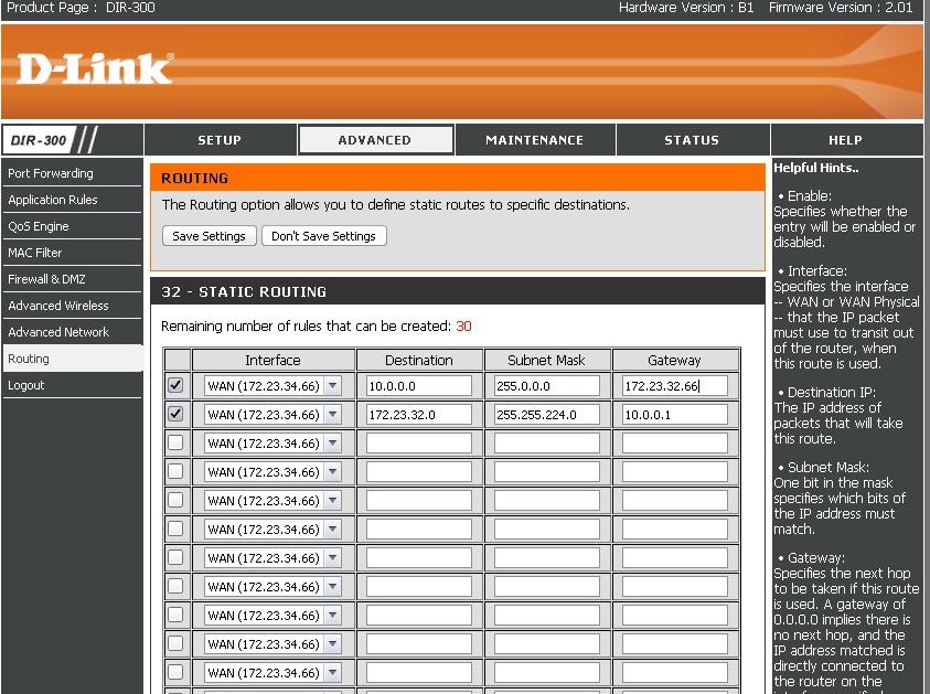 Очень прошу помочь настроить роутер Dlink DIR-300. Инет приходит через Lan со статическим IP и проверкой MAC-адреса. IP 172.23.34.66 Маска подсети 255.255.224.0 Шлюз 172.23.32.254 это настройки инета.... то есть настраиваю роутер на инет... ну с клонированием Mac-адреса. DNS#1 192.168.0.222 DNS#2 172.23.32.254 внутренний IP-адрес роутера 10.0.0.1 ; маска-подсети 255.0.0.0 и включен Dhcp-сервер. UPnP -включен... Нужно отправить инет по wifi...в ноуты... Никак не удается... МОжет быть надо что-то прописать в разделе роутинг или port-forwarding. пытался ввести в роутинге: скрин внизу. Помогите пожалуйста люди умные )) неумному) |