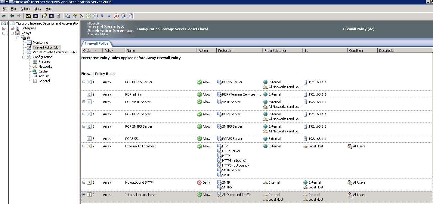 Профиль | Сайт | Отправить PM | Цитировать berk2030, правило 8 - Deny. оно запрещает исходящий траффик. Просто создайте новое правило разрешающее SMTP от почтового сервера в Интернет. По поводу удаленного доступа в личку до 18.00 Москвы, далее буду недоступен.