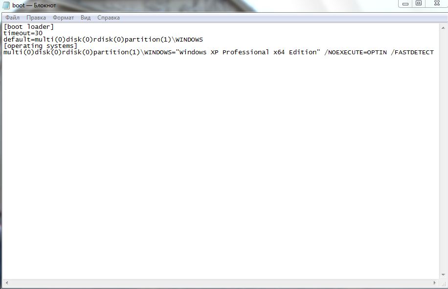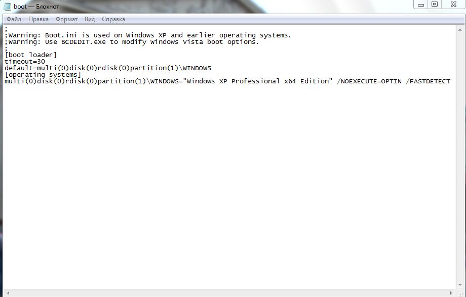 Профиль | Отправить PM | Цитировать Наверно я не правильно выразился. Начну сначала. Был компьютер чистый без ОС с 2-мя жесткими дисками. Я поставил сначала на первый жесткий диск ОС Win XP Prp x64, 2-ой жесткий диск был пуст. В результате файл boot.ini выглядел так (см Рисунок 1). Месяц спустя поставил на 2-ой пустой жесткий диск ОС Win 7 Ultimate x64. В результате у меня на компе стало 2 ОС. Так вот после установки 2-ой ОС файл boot.ini стал выглядеть так (см рисунок 2). Сразу вопрос 1-ый из 3-ёх, должно ли быть так, ведь у меня 2 ОС стоит так почему же в файле boot.ini не прописалась Win 7, а вместо этого прописалась предупреждение какое-то???