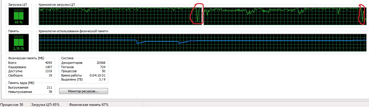 Доброго времени суток. Вобщем у меня требовательные игры подвисают иногда на пол секунды, при этом кулеры на видюхе сбрасывают обороты, как будто при снижении ее деятельности. Думал проблема у меня в видеокарте. Тестил фурмарком на максимуме - все нормально, ничего не виснет. Помоему это процессор. Спецом запустил диспечтер задач, вкладку "Быстродействие". Ну включил игру, спустя пол часа игра подвисла опять. Сворачиваю, посмотреть че там было, может какие процессы левые грузят. Вобщем такая картина: на мгновение проц тупо снизил свою работу (оба ядра) и снова заработал. Вот картинка. Может быть кто знает в чем может быть проблема?
