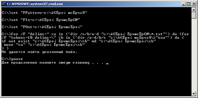 Maartimus, пакетные файлы надо сохранять в кодировке 866 любым поддерживающим это редактором.