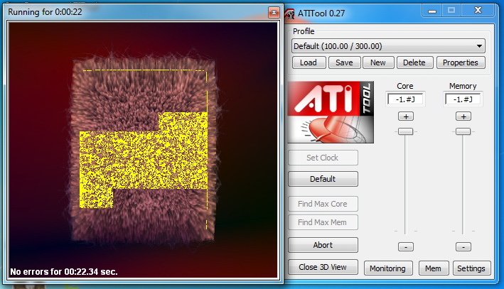 Решил проверить её на AtiTool v 0.26, также v 0.27 Если нажать Close 3D View то куб крутится и все ок (10+ минут проверял) Если нажать Scan for Artifacts то через 1-2 секунды после запуска начинается вот такая фигня как на рисунках (на обеих версиях программы) Также проверял эту видеокарту программами FurMark , TessMark и GPU Caps Viewer - все видео были нормальными без глюков. Температура при крит нагрузке выше 65 градусов не поднималась. Проц Core i5-750, мать P7P55D, БП - Chieftec CFT-650-14C Разгоном не занимался. Это нормально или нет что AtiTool выдает такие желтые полоски при тесте на стабильность??? АтиТул 2007г (последняя версия) может это играет какую то роль, но тогда и в старых играх могут быть глюки или все таки это видеокарта плохая ? |