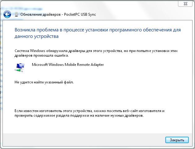 Установка - Проблема при установке драйвера устройства "PocketPC USB Sync"