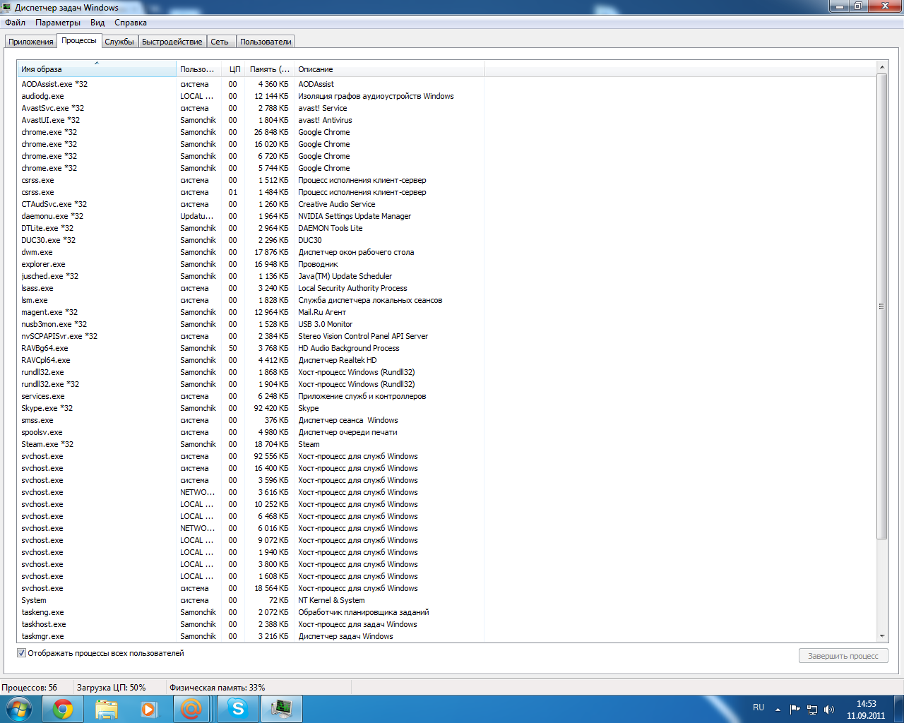 Всем привет , все у меня с компом было супер , все игры шли на максимальных без лагов , и вот однажды запустил я Call of Duty 6 и вижу что какае-то непонятные лаги , поставил оптимальные настройки , лаги не исчезли.....запустил другие игры и там такие же лаги и не понятные проседание фпс....Вот недавно включил комп, зашел в диспетчер задач а там нагрузка ЦП никак не ниже 50%...в чем может быть проблема??Все новые/лишнее проги удалил , прочистил реестр ccleaner поставил последние обновления Windows 7 64 , сделал полное сканирование на вирусы при загрузке avastом , драйвера стоят свежие .....скриншоты процессов вложил....
