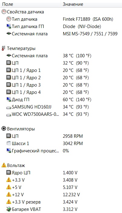 И, еще вопрос можно ли как то через виндовс посмотреть кол-во оборотов кулера и есть ли какая-либо специальная программа, которая бы могла это показать. А не биос, у меня раздел H/V monitor. И есть ли программа для виндовс, которая бы могла бы регулировать автоматику на кулере. Или это дело пустое, я так понимаю. Просто для себя интересно понять, просто такие вопросы возникли в голове, чисто для себя лично понять. Если возможно, посоветуйте как специалисты. Вот, в разделе H/V Monitor - SPU Smart FAN Target поставила значение 50. Подскажите, пожалуйста, этого достаточно для процессора Athlon II X4. Шум стал заметнее тише. Вот, ниже скрин в спокойном режиме, тест. Чуток позже выложу, при тесте в аиде. Замер датчиков аиды при нагрузке на комп, при помощи теста в программе аида Возросла температура ядер очень сильно, это очень опасно..., не шкалит? Прошу вас, специалисты ответьте? |
