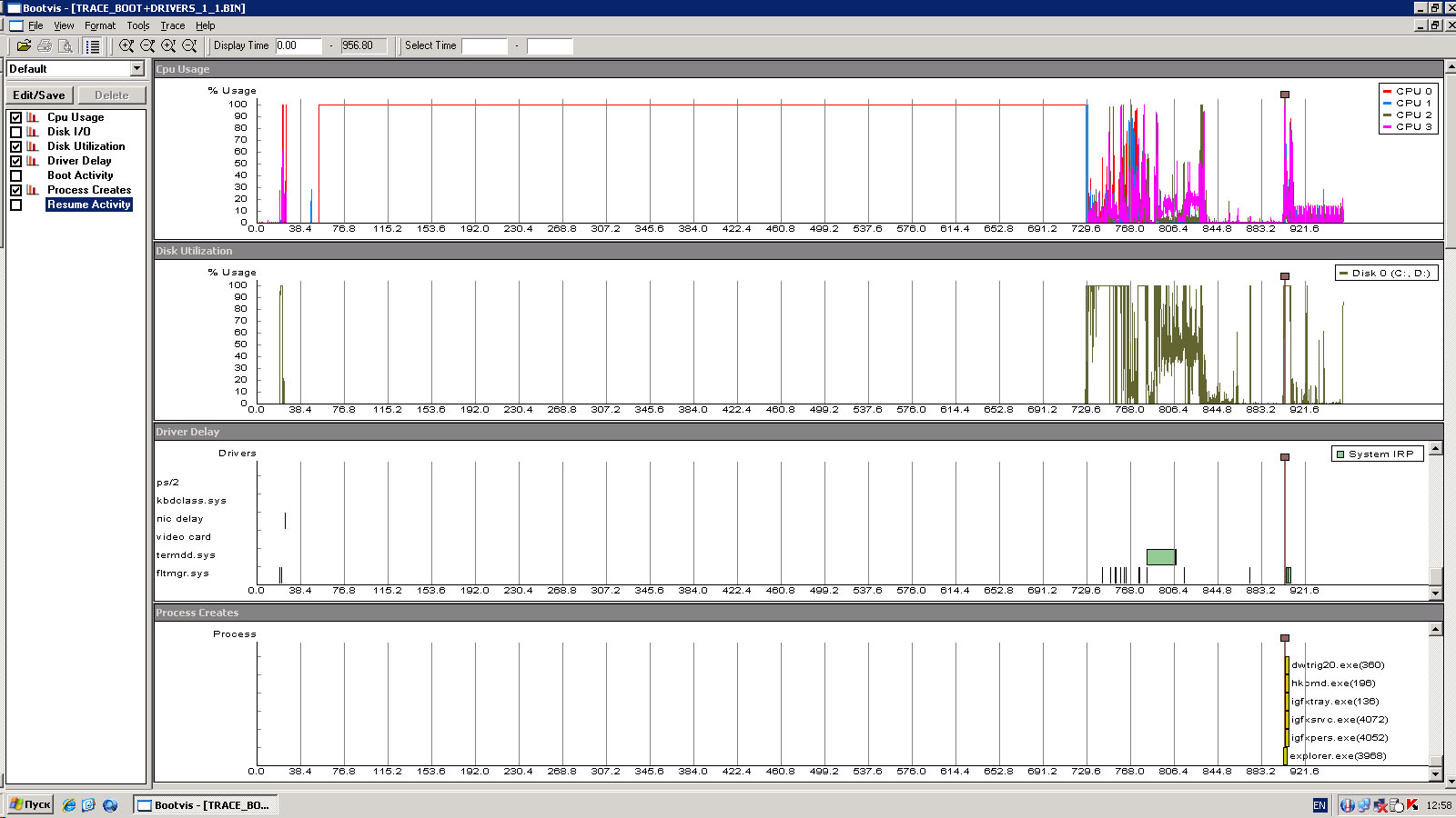 Еще раз запустил ProcessMonitor, на этот раз результат совсем другой - захвачен весь период загрузки. Одновременно запустил и BootViz (скрин во вложении, заодно там и скролиинг ранее скрытый раскрыт) Так вот, в выдержке из лога ПМ пауза 14:06:11-14:17:39, это 10 мин 40 сек, и соответсвует паузе с занятостью CPU на диаграмме BootViz. Заканчивается на загрузке драйверов и продолжается на загрузке реестра. Что такое DeviceUsageNotification? 14:06:11,4823425 smss.exe 412 CreateFile C:\WINDOWS\system32\drivers\atapi.sys SUCCESS Desired Access: Execute/Traverse, Disposition: Open, Options: , Attributes: n/a, ShareMode: Read, Delete, AllocationSize: n/a, OpenResult: Opened 14:06:11,4823791 smss.exe 412 CreateFileMapping C:\WINDOWS\system32\drivers\atapi.sys SUCCESS SyncType: SyncTypeCreateSection, PageProtection: PAGE_EXECUTE 14:06:11,4824024 smss.exe 412 CreateFileMapping C:\WINDOWS\system32\drivers\atapi.sys SUCCESS SyncType: SyncTypeOther 14:06:11,4824155 smss.exe 412 QueryStandardInformationFile C:\WINDOWS\system32\drivers\atapi.sys SUCCESS AllocationSize: 98 304, EndOfFile: 96 768, NumberOfLinks: 1, DeletePending: False, Directory: False 14:06:11,4827434 smss.exe 412 CreateFileMapping C:\WINDOWS\system32\drivers\atapi.sys SUCCESS SyncType: SyncTypeCreateSection, PageProtection: PAGE_EXECUTE 14:06:11,4827557 smss.exe 412 CreateFileMapping C:\WINDOWS\system32\drivers\atapi.sys SUCCESS SyncType: SyncTypeOther 14:06:11,4829387 smss.exe 412 CreateFile C:\WINDOWS\system32\drivers\wmilib.sys SUCCESS Desired Access: Execute/Traverse, Disposition: Open, Options: , Attributes: n/a, ShareMode: Read, Delete, AllocationSize: n/a, OpenResult: Opened 14:06:11,4829666 smss.exe 412 CreateFileMapping C:\WINDOWS\system32\drivers\wmilib.sys SUCCESS SyncType: SyncTypeCreateSection, PageProtection: PAGE_EXECUTE 14:06:11,4829839 smss.exe 412 CreateFileMapping C:\WINDOWS\system32\drivers\wmilib.sys SUCCESS SyncType: SyncTypeOther 14:06:11,4829919 smss.exe 412 QueryStandardInformationFile C:\WINDOWS\system32\drivers\wmilib.sys SUCCESS AllocationSize: 8 192, EndOfFile: 6 656, NumberOfLinks: 1, DeletePending: False, Directory: False 14:06:11,4831451 smss.exe 412 CreateFileMapping C:\WINDOWS\system32\drivers\wmilib.sys SUCCESS SyncType: SyncTypeCreateSection, PageProtection: PAGE_EXECUTE 14:06:11,4831616 smss.exe 412 CreateFileMapping C:\WINDOWS\system32\drivers\wmilib.sys SUCCESS SyncType: SyncTypeOther 14:06:11,4832848 smss.exe 412 CloseFile C:\WINDOWS\system32\drivers\wmilib.sys SUCCESS 14:06:11,4833732 smss.exe 412 CloseFile C:\WINDOWS\system32\drivers\atapi.sys SUCCESS 14:06:11,4834158 smss.exe 412 DeviceUsageNotification C: SUCCESS 14:17:39,5046628 smss.exe 412 QueryNameInformationFile C:\WINDOWS\system32\config\SECURITY SUCCESS Name: \WINDOWS\system32\config\SECURITY 14:17:39,5047097 smss.exe 412 QueryNameInformationFile C:\WINDOWS\system32\config\software SUCCESS Name: \WINDOWS\system32\config\software 14:17:39,5047311 smss.exe 412 QueryNameInformationFile C:\WINDOWS\system32\config\system SUCCESS Name: \WINDOWS\system32\config\system 14:17:39,5047637 smss.exe 412 SetEndOfFileInformationFile C:\WINDOWS\system32\config\default.LOG SUCCESS EndOfFile: 57 344 14:17:39,5048536 smss.exe 412 QueryNameInformationFile C:\WINDOWS\system32\config\default SUCCESS Name: \WINDOWS\system32\config\default 14:17:39,5048772 smss.exe 412 SetEndOfFileInformationFile C:\WINDOWS\system32\config\SAM.LOG SUCCESS EndOfFile: 8 192 14:17:39,5049217 smss.exe 412 QueryNameInformationFile C:\WINDOWS\system32\config\SAM SUCCESS Name: \WINDOWS\system32\config\SAM 14:17:39,5056651 smss.exe 412 CreateFile C:\WINDOWS\ntbtlog.txt SUCCESS Desired Access: Generic Write, Disposition: OpenIf, Options: Sequential Access, Synchronous IO Non-Alert, Non-Directory File, Attributes: N, ShareMode: Read, AllocationSize: 0, OpenResult: Opened 14:17:39,5162555 smss.exe 412 WriteFile C:\WINDOWS\ntbtlog.txt SUCCESS Offset: -1, Length: 30 14:17:39,5162698 smss.exe 412 ReadFile C:\WINDOWS\ntbtlog.txt SUCCESS Offset: 192 512, Length: 2 842, I/O Flags: Non-cached, Paging I/O, Synchronous Paging I/O 14:17:39,5222545 smss.exe 412 CloseFile C:\WINDOWS\ntbtlog.txt SUCCESS 14:17:39,5263779 smss.exe 412 CreateFile C:\WINDOWS\ntbtlog.txt SUCCESS Desired Access: Generic Write, Disposition: OpenIf, Options: Sequential Access, Synchronous IO Non-Alert, Non-Directory File, Attributes: N, ShareMode: Read, AllocationSize: 0, OpenResult: Opened 14:17:39,5264025 smss.exe 412 WriteFile C:\WINDOWS\ntbtlog.txt SUCCESS Offset: -1, Length: 50 14:17:39,5264110 smss.exe 412 CloseFile C:\WINDOWS\ntbtlog.txt SUCCESS 14:17:39,5264432 smss.exe 412 RegOpenKey HKLM\SYSTEM\CURRENTCONTROLSET\CONTROL\BOOTLOG REPARSE 14:17:39,5264536 smss.exe 412 RegOpenKey HKLM\System\CurrentControlSet\CONTROL\BOOTLOG SUCCESS (Что-то прикрепленных картинок не видно, хотя на индикаторе вложений они есть, что не так сделал?) события в журнале "система" (по возрастающей): 14-05 - остановка журнала событий 14-17 - мультипроцессор фри 14-17 - журнал запущен 14-17 - AELookUP запущен 14-17 - NTP - клиент получает... 14-06 - HECI - Intel(R) Management Engine Interface driver has started successfully. 14-06 - IPSec Драйвер IPSEC запущен в режиме обхода. Безопасность IPSEC не будет применена во время запуска компьютера. 14-06 - TCP-IP Система обнаружила, что сетевой адаптер Realtek PCIe GBE Family Controller был подключен к с