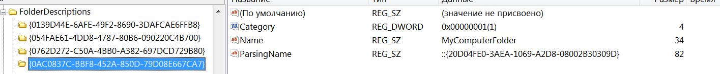 1. HideOnDesktopPerUser - REG_SZ - (нет значения) PinToNameSpaceTree - REG_SZ - (нет значения) 2. Category - REG_DWORD - 0x00000001(1) Name - REG_SZ - MyComputerFolder ParsigName - REG_SZ - ::{20D04FE0-3AEA-1069-A2D8-08002B30309D} |