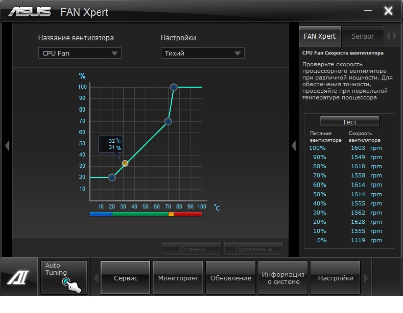 Всем привет! кулер GlaciaTech H46, мать Asus P8Z68V-LX, проц I5-2500k. Q-Fan включен в настройках в биосе. установлен режим "тихий". при этом кулер крутит на полную ~1500 об/мин. температура проца 31 градус