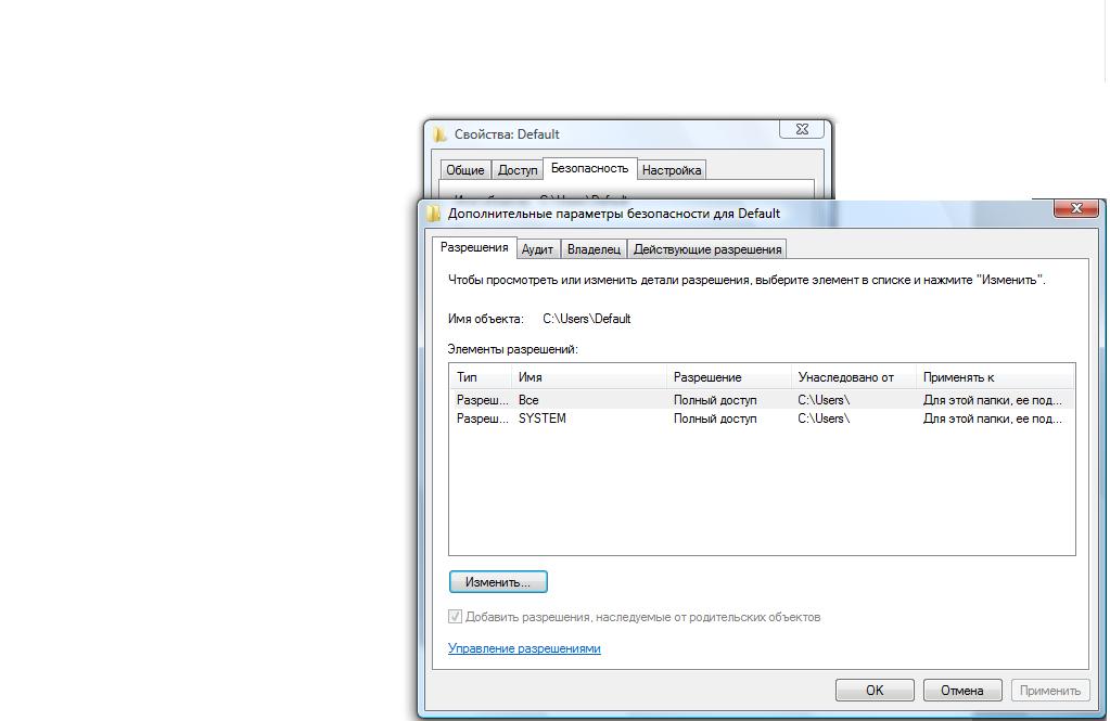 Профиль | Отправить PM | Цитировать Зашла как вы сказали в С:\USERS\DEFAULT - СВОЙСТВА -БЕЗОПАСТНОСТЬ - ДОПОЛНИТЕЛЬНО - И НАЖАЛА "ЗАМЕНИТЬ ВСЕ НАСЛЕДУЕМЫЕ РАЗРЕШЕНИЯ ДЛЯ ВСЕХ ПОТОМКОВ НА НОВЫЕ НАСЛЕДУЕМЫЕ РАЗРЕШЕНИЯ ОТ ЭТОГО ОБЪЕКТА"