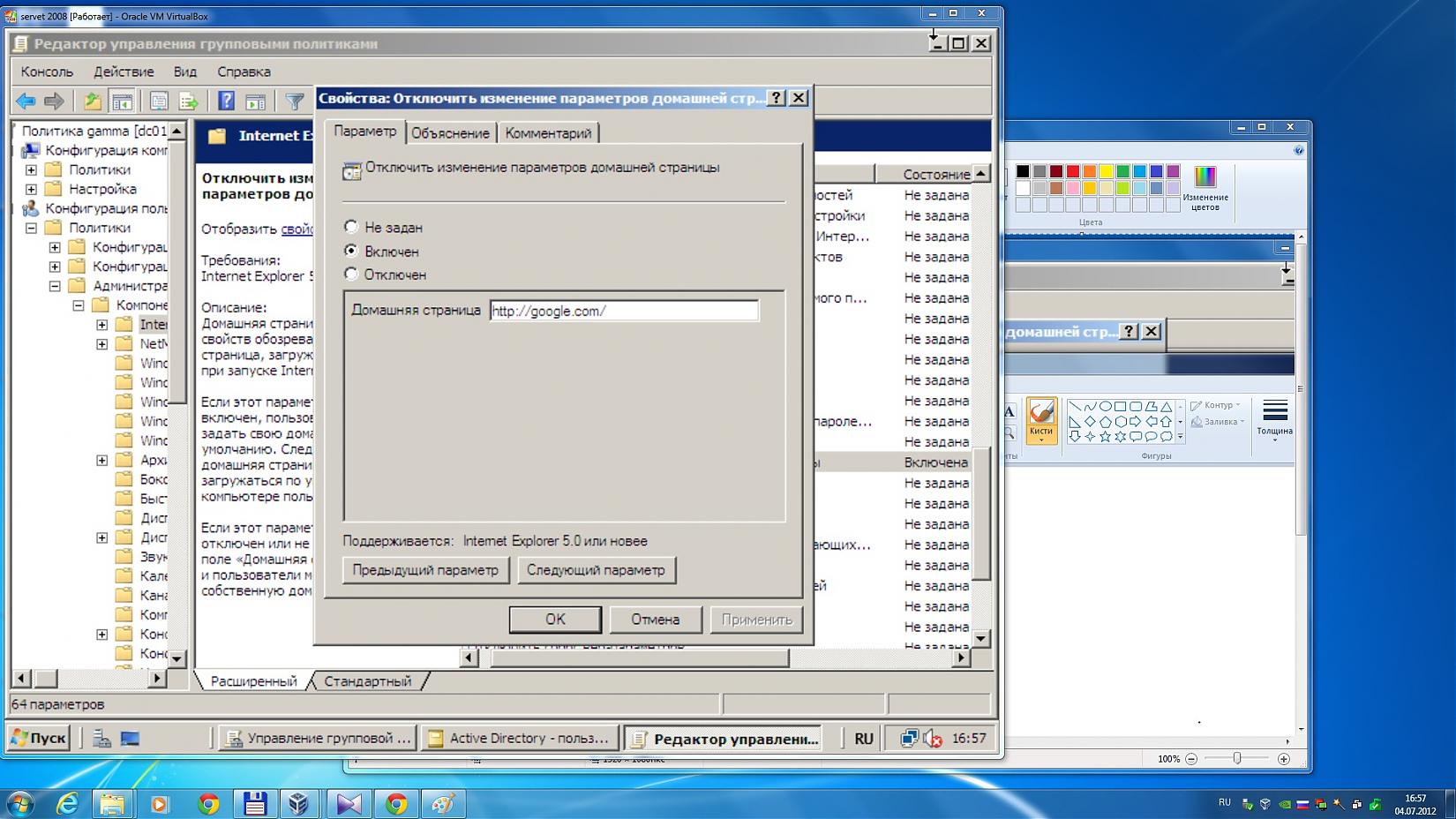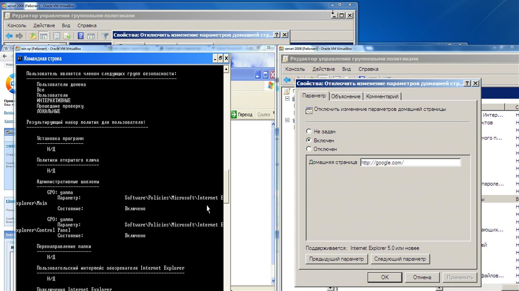 с помощью групповой политики задал чтобы IE по умолчанию открывал http://google.com/ Создал новый OU и поместил в него комп и пользователя и применил эту политику. При перезагрузки когда захожу в свойства обозревателя, домашняя страница заблокирована, но почему-то не применилась политика открытия страницы гугл по умолчанию (открывается страница майкрософта) Патч KB 943729 установил. Как сделать чтобы она сработала полностью?? PS менял в конфигурации пользователя. |