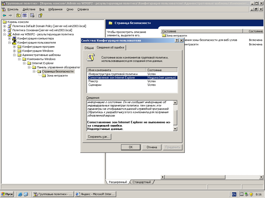 Столкнулся с проблемой назначения уровня безопасности зоны в Internet Explorer 6. Опустим сейчас лирику касательно того, почему такое старьё ещё используется (верстальщик вообще может броситься на меня с кулаками). Есть домен на Windows Sever 2003 SP1. Для организационной единицы назначена групповая политика. Составляю результирующую политику и вижу сообщение об ошибке: