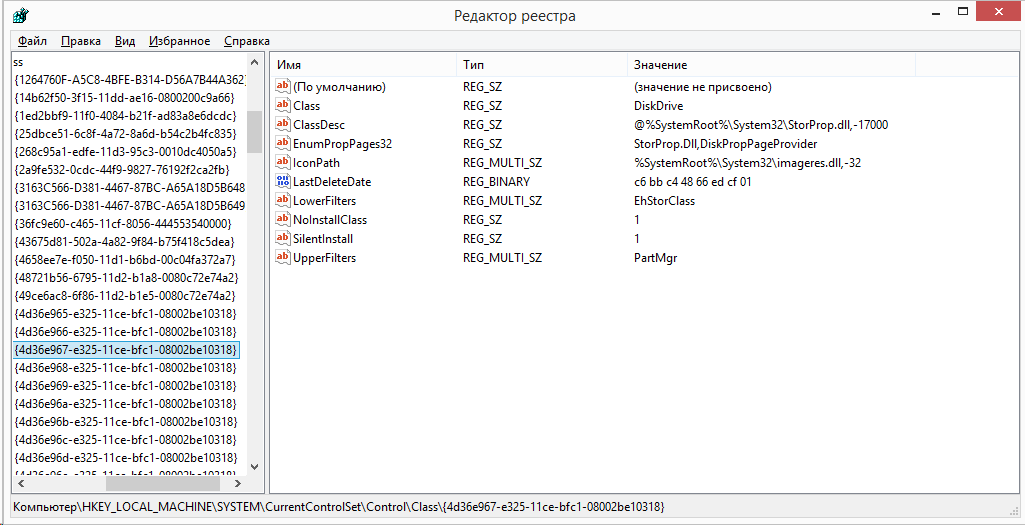 Опишу что происходит: Вставляю флешку,слышу звук подключени "ту ду ду"...но реакции нет вообще никакой. В моем компьютере так же ничего не появляется. Реакцию можно заметить только в Диспетчере устройств. В разделе "Дисковые устройства" появляется silicon -power USB Device. На значке виднеется восклицательный знак Если проверить состояние,то видно: Не удалось загрузить драйвер этого устройства. Возможно, драйвер поврежден или отсутствует. (Код 39) {Загрузка драйвера устройства невозможна} Не удалось загрузить драйвер устройства %hs. Код ошибки 0x%x Мои действия: -Пробывал вставлять 3 флешки разных размеров и от разных производителей в разные USB (от всех один и тот же результат,неудачный) -Мышь себя чувствует в любой USB отлично. iPhone подключается и распознается тоже без проблем. Так же пробовал подключать внешний сидюк,работает. -Искал параметры LowerFilters и UpperFilters в разделе реестра HKEY_LOCAL_MACHINE\SYSTEM\CurrentControlSet\Control\Class\{36FC9E60-C465-11CF-8056-444553540000} (не нашел) -Удалял в Диспетчере устройств все Контроллеры USB (драйвера поставились автоматически снова,результат тот же) -Пробывал программу MK Quick Fix (она заглючила и зависла со словами "Working..."странная программа,не советую) Вроде все...мож че забыл -букву флешки поменять не могу,т.к не её не видно Ах да...винда стоит 8.Использую ноутбук acer aspire V3-571G (если это имеет значение) |