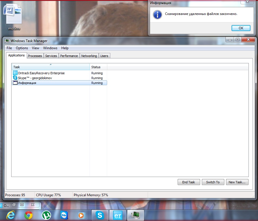 2. Осуществлен запуск полного сканирования. По завершении (примерно через 20 часов) если в диалоге "Сканирование удалённых файлов завершено" нажать на кнопку OK, диалог пропадает, но обнаружить главное окно программы не удаётся (например переключением Alt-Tab) и, соответственно, не удаётся сохранить полученные результаты (данные)