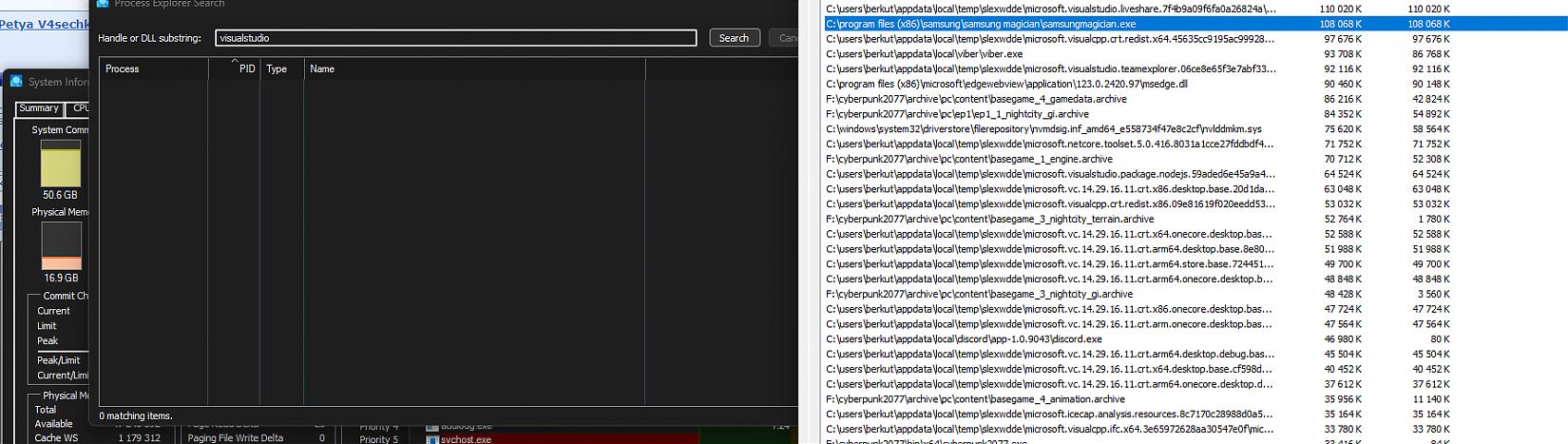 Но не все Приложил скриншот, из выборочных примеров, по киберпанку, вайберу и скайпу - находит (они открыты и это выглядит как норма) visualstudio и samsungmagician - не находит, хотя в списке File Summary они есть Эти программы я не открывал, но их кто-то зачем-то и почему-то, выгрузил в оперативу А тем временем, двое суток непрерывного аптайма - и реальные 50 гигабайт оперативы уже безвозвратно съедены хрен пойми какими файлами ) Если закрыть игру - какая-то часть памяти высвободится, но это не годится никуда - двое суток игра просто висела в фоне, а память уже на исходе Закрытие игры лишь отложит необходимость перезапуска, без нормальной возможности зайти поиграть |