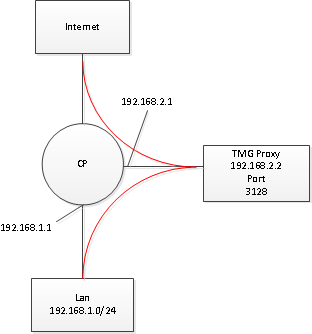 Профиль | Отправить PM | Цитировать Http трафик из сети 192.168.1.0/24 шлюз один из интерфейсов CP 192.168.1.1 должен попасть в интернет через прокси сервер 192.168.2.2:3128 сеть 192.168.2.0/24 шлюз CP 192.168.2.1. Если явно в браузере прописываю прокси то доступ в инет есть. На CP настроен роутинг между сетями и нат с прокси в инет. На прокси