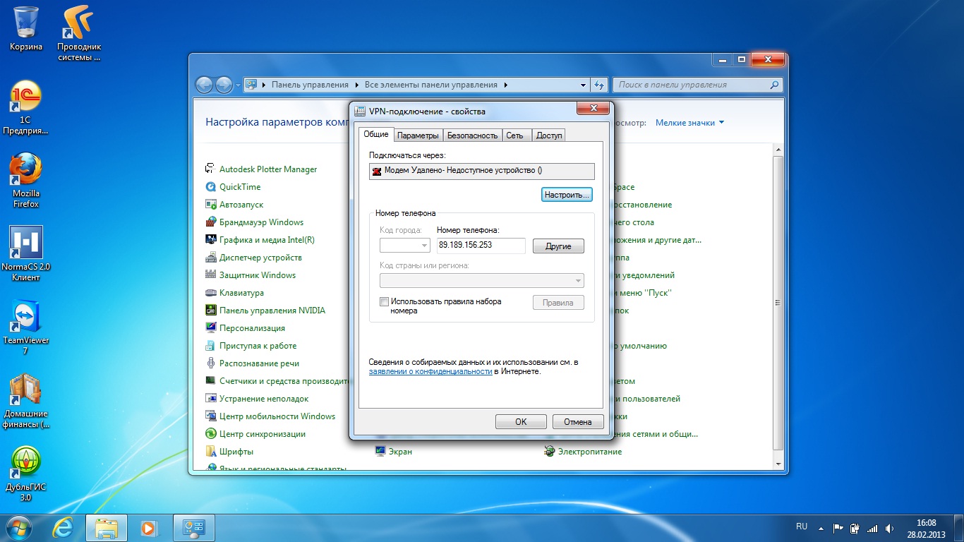 1 - Заходим в «центр управления сетями и общим доступом» 2 - Нажимаем «настройка нового подключения или сети» 3 - Нажимаем «подключение к рабочему месту» (если появляется вопрос «использовать имеющееся подключение?» нажимаем «Нет, создать новое подключение») 4 - Выбираем пункт «Использовать мое подключение к интернету (VPN)» 5 – Далее в поле «интернет адрес» вводим 89.189.156.253 В поле «Имя местоназначения» можно ввести «сеть озна» 6 – Далее вводим учетку. Получаем сообщение: "Сбой подключения с ошибкой 797 Подключение к серверу удаленного доступа не установлено, поскольку не найден модем" |