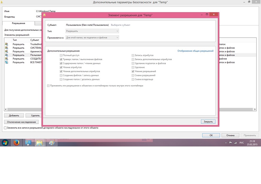Petya V4sechkin, не выходит изменить.. После нажатия "Изменить разрешения" выходит окно 1 (см.вложение), и настройки -основные (окно2) и дополнительные (окно3)- доступны только в режиме просмотра, а не редактирования..