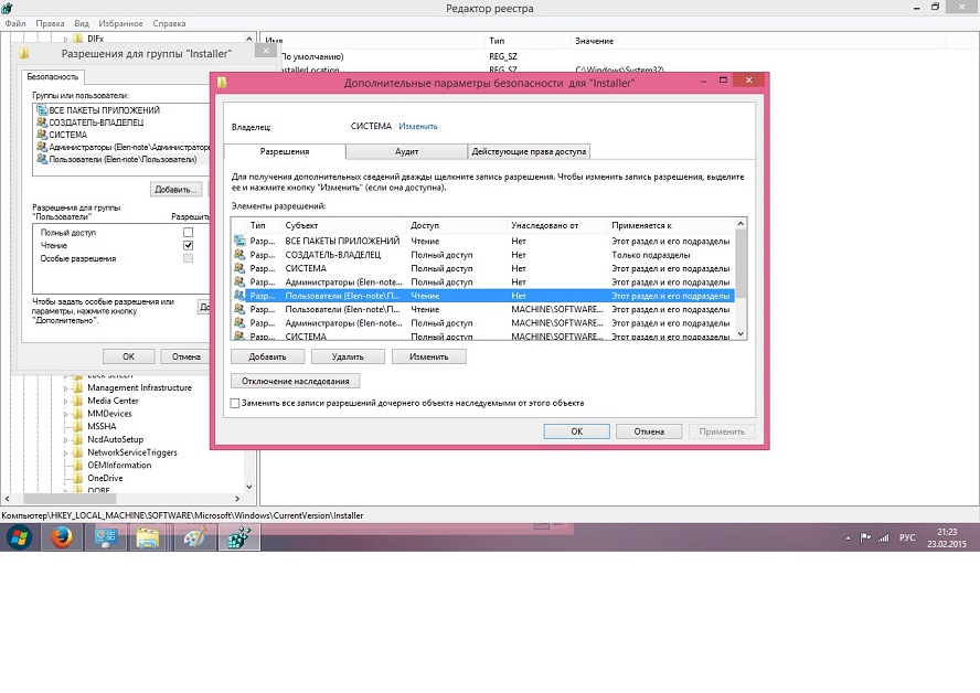 почитав предыдущие коменты, попробовала зайти в раздел HKEY_LOCAL_MACHINE\SOFTWARE\Microsoft\Windows\CurrentVersion\Installer, далее открываю свойства этого раздела....что нужно делать дальше?