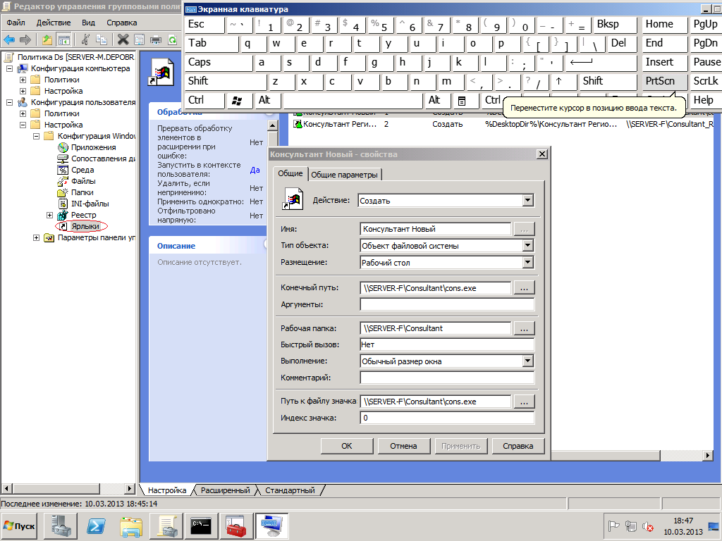 в журнале есть предупреждение "Уровень Дата и время Источник Код события Категория задачи Предупреждение 10.03.2013 18:43:34 Group Policy Shortcuts 4098 (2) "Элемент предпочтения пользователь ""Консультант Новый"" в объекте групповой политики ""Ds {31B2F340-016D-11D2-945F-00C04FB984F9}"" не применен по причине ошибки с кодом ""0x80070002 Не удается найти указанный файл."" Эта ошибка была отключена." Cruzenshtern, я думаю как раз понял почему не работает как раз в журнале пишется об ошибке но как устранить. |