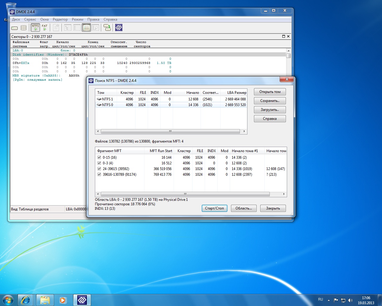 См. пост Antech Отправлено: 13:08 06-04-2009 Восстановление таблицы разделов (не данных) http://gallery.ru-board.com/topic.cg...509&start=1600 Что делать...???... Запустите полный поиск NTFS разделов на ВСЮ поляну. Результаты поиска можно сохранять в контрольной точке и загружать, чтобы продолжить поиск в удобное время. Попробуйте затем в DMDE восстановить отдельные файлы на другой носитель. Знаю, что у Вас его нет, но придётся раздобыть... Добавлено ======= В DMDE сделайте MBR OFF это для того, чтобы ВЫы и Winduws не видели раздела/тома и не писали поверх информации, которая там осталась, но может перекрываться... Цитата Aristokrat: