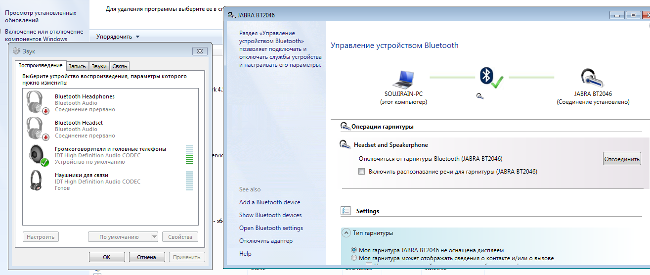Доброго времени суток! Появилась необходимость подключить гарнитуру Jabra BT2046 к ноутбуку HP Pavilion m6-1060er, но после сопряжения появилась проблема: в меню "Звук" устройства Bluetooth Headphones и Bluetooth Microphone отображаются с подписью "Соединение прервано" и выбрать гарнитуру в качестве устройства для воспроизведения и записи не представляется возможным