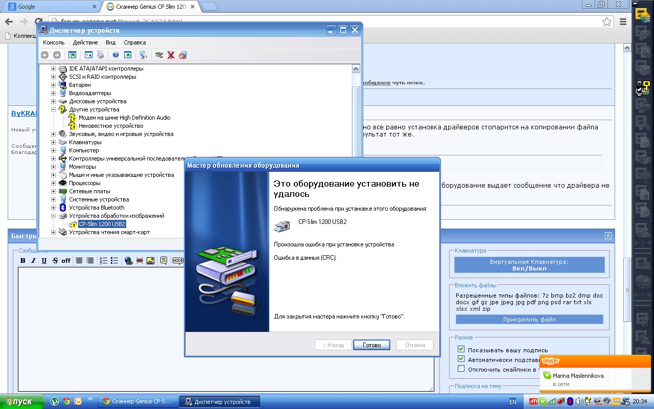 В общем суть проблемы: имеется данный сканнер, который успешно работал на ноутбуке с WinXp SP3 до непонятного глюка с системой и дальнейшего ее восстановления. После восстановления драйверы на все устройства слетели, поставил все вновь, но при установке драйверов на сканер выпадает "ошибка в данных (CRC)" при копировании файла usbscan.sys. при этом в диспетчере устройств состяние устройства показывается как "для устройства не установленны драйверы (Код 28)" При попытке удалить сканнер из системы вываливается сообщение "Не удалось удалить устройство. Возможно, это устройство необходимо для выполнения загрузки компьютера" В безопасном режиме все то же самое. Уже и не знаю что делать..... Сканер нужен срочно! |