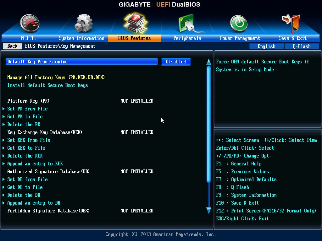 Я активировал самый первый пункт, там где речь идет о дефолтных ключах. Поставил ENABLE. Сохранился, перегрузился, зашел и ключи уже были. woopwoop, Самому ничего вводить не нужно. Все ключи уже введены и зашиты в БИОС. Вам нужно только активировать эти ключи. |