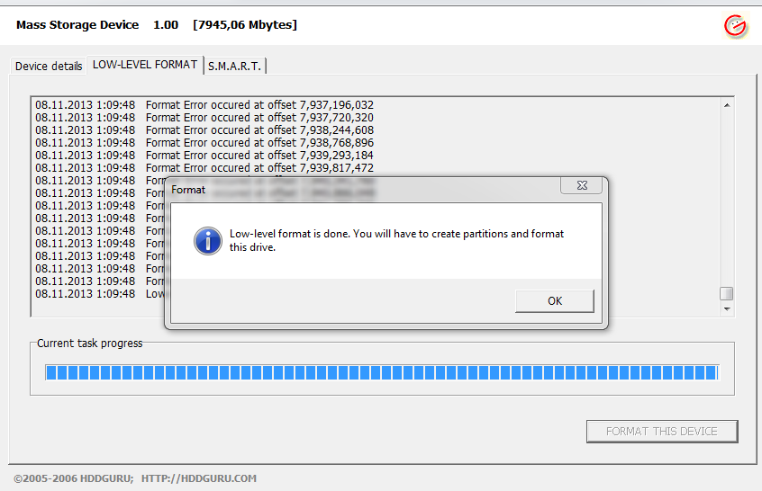 Quick erase - Пишет процесс завершен. Full erase - Процесс зависает на начальной стадии и нечего не происходит , нет сообщений об ошибках нет завершение операции ,скриншот выкладываю Error Scan Write-Сейчас сделаю тест скин выложу . Read test - ошибок не нашел Format - выкидывает в штатное форматирование виндус , и ошибка стандартная " не удалось завершить форматирование" Вот скрины |