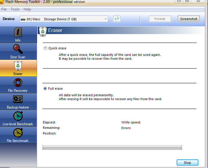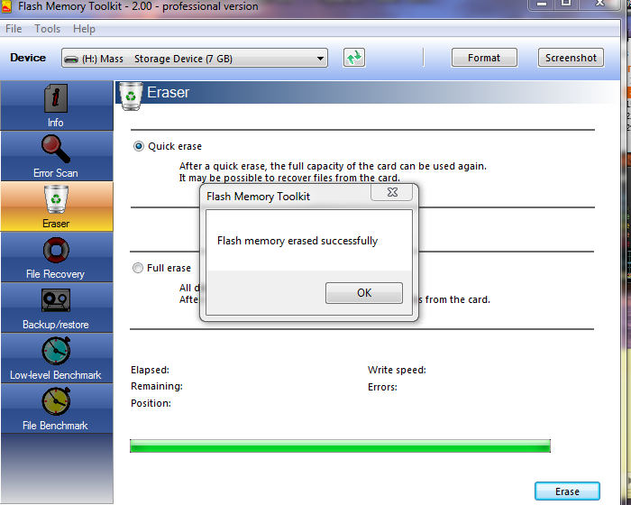 - нажать кнопку Eraser и выбрать пункт Full erase. В конце операции и/или в случае ошибки снять скриншот.Цитата 07sergei1: