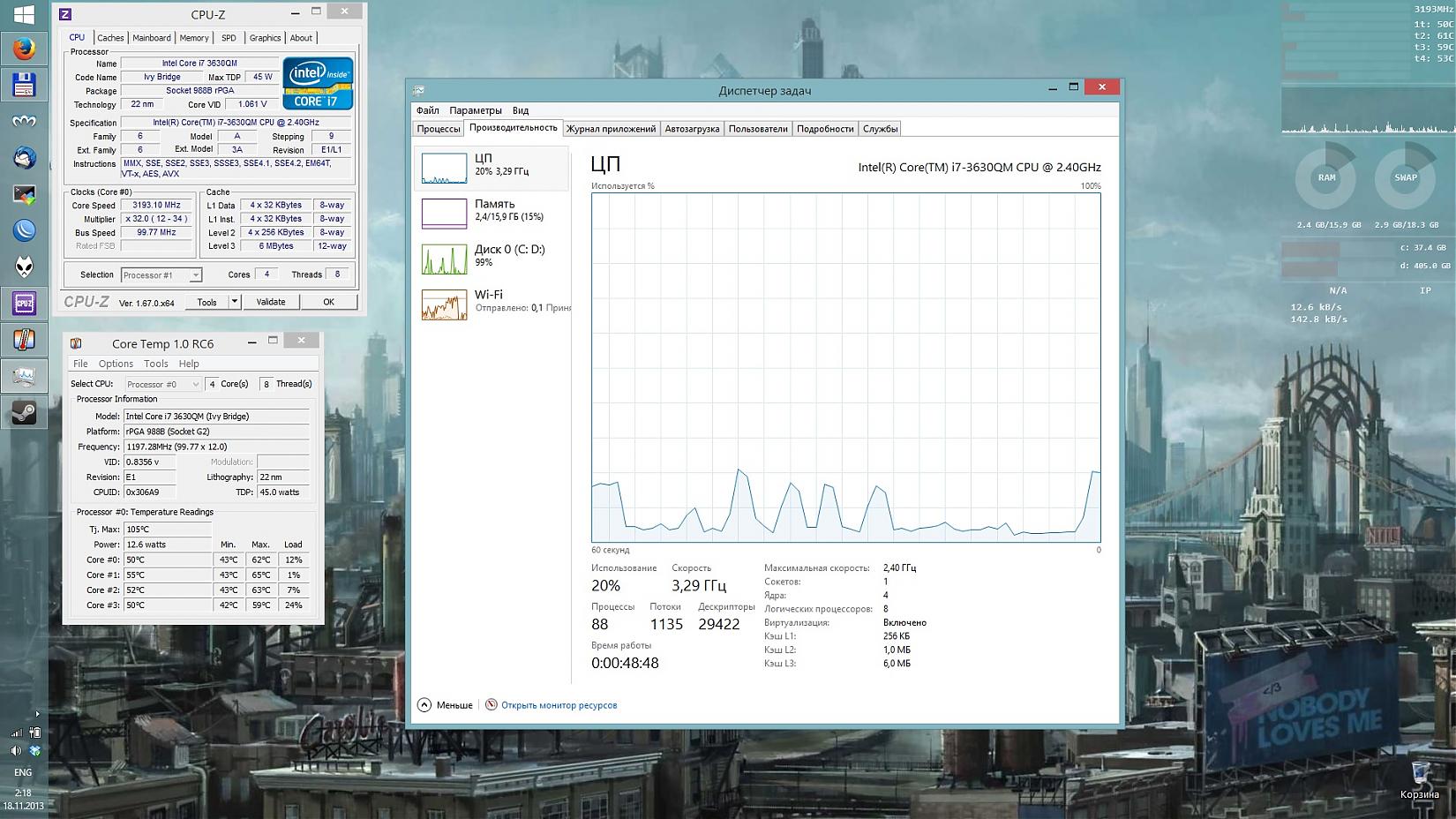 Недавно столкнулся с некоторой странностью при попытке определить текущую частоту процессора достаточно популярными программами (да даже стандарнтым диспетчером задач восьмерки). Имеется: 1. Ноутбук Lenovo Y500, с процессором Core i7 3630QM (татовая частота до 2.4ГГц и турбо до 3.4) и Windows 8.1 x64 на борту. 2. Программы для определения частоты: Диспетчер задач Windows 8.1, CPU-Z, CoreTemp, Rainmeter (с плагином, который берет частоту от CoreTemp) Как видно на скриншоте, частота определяется как-то не везде одинаково. Ну и, собственно, вопрос: почему?! |