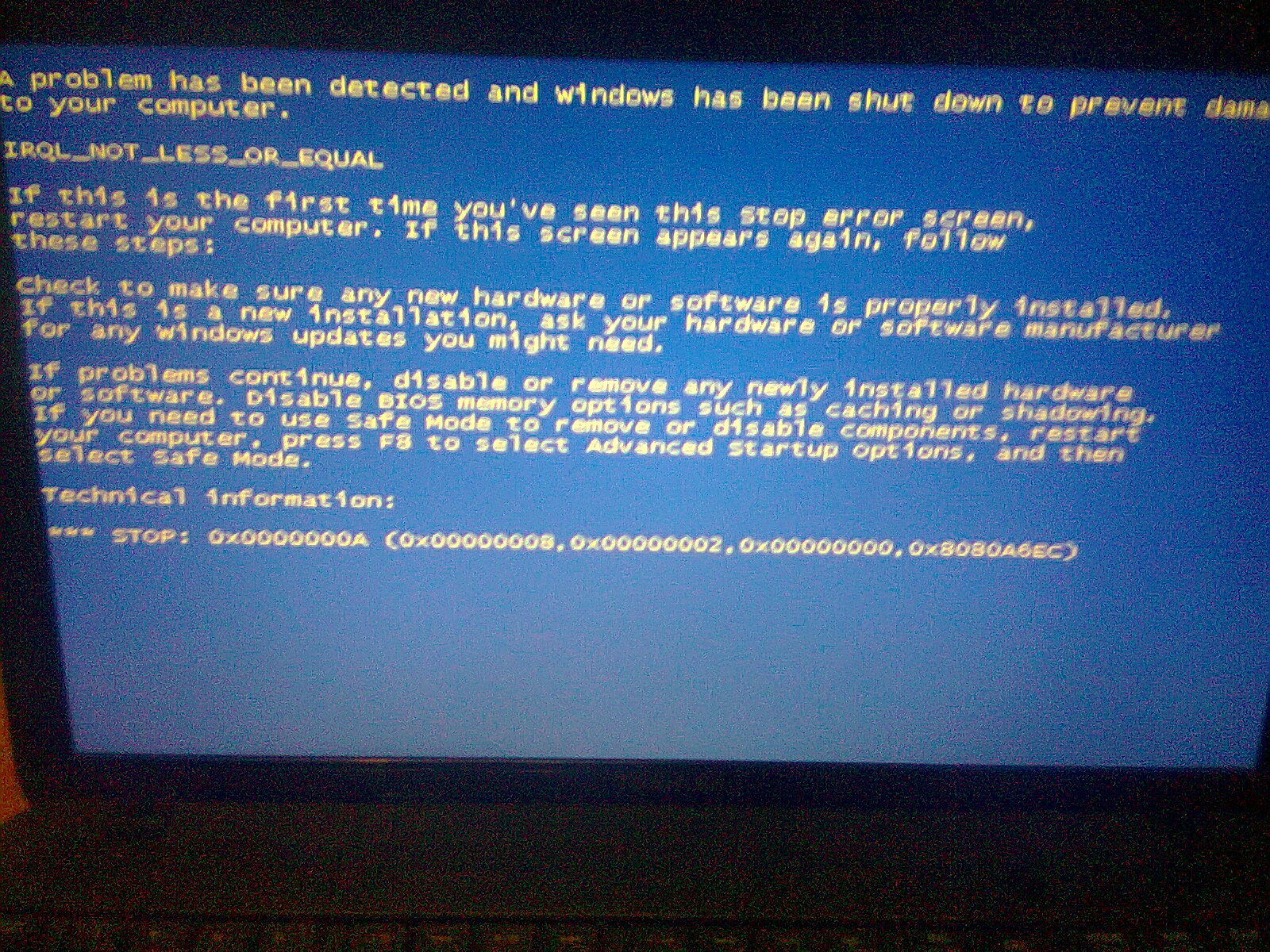 попробуйте выполнить сброс настроек БИОС перед установкой системы. после выставите заново первое загрузочное устройство дисковод\флешку. снова выполните установку. также смотрите рекомендации В Windows XP отображение сообщения об ошибке "Stop error code 0x0000000A (IRQL_NOT_LESS_OR_EQUAL)" |