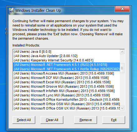 Профиль | Сайт | Цитировать Wuzz, Установите Windows Installer CleanUp Utility,потом запустите это программу и посмотрите нет ли в списке установленных программ Microsoft .NET Framework 4.5.1 или Microsoft .NET Framework 4.5 или Microsoft .NET Framework 4,если есть удалите и повторите установку Microsoft .NET Framework 4.5.1