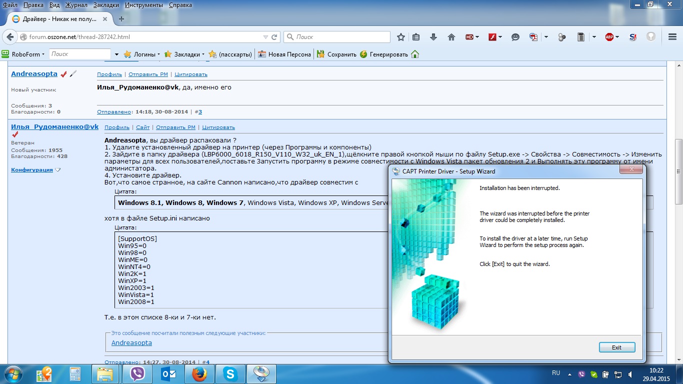 1. Удалите установленный драйвер на принтер (через Программы и компоненты) 2. Зайдите в папку драйвера (LBP6000_6018_R150_V110_W32_uk_EN_1),щёлкните правой кнопкой мыши по файлу Setup.exe -> Свойства -> Совместимость -> Изменить параметры для всех пользователей,поставьте Запустить программу в режиме совместимости с Windows Vista пакет обновления 2 и Выполнять эту программу от имени администатора. 4. Установите драйвер. Вот,что самое странное, на сайте Cannon написано,что драйвер совместим с Цитата: