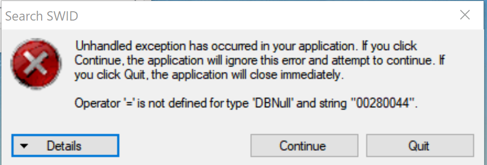just-in-time (JIT) debugging instead of this dialog box. ************** Exception Text ************** System.InvalidCastException: Operator '=' is not defined for type 'DBNull' and string "00280044". at Microsoft.VisualBasic.CompilerServices.Operators.ConditionalCompareObjectEqual(Object Left, Object Right, Boolean TextCompare) at FSCMAPv2.SearchSWIDForm.AddFavoriteToolStripMenuItem_Click(Object sender, EventArgs e) at System.Windows.Forms.ToolStripItem.RaiseEvent(Object key, EventArgs e) at System.Windows.Forms.ToolStripMenuItem.OnClick(EventArgs e) at System.Windows.Forms.ToolStripItem.HandleClick(EventArgs e) at System.Windows.Forms.ToolStripItem.HandleMouseUp(MouseEventArgs e) at System.Windows.Forms.ToolStripItem.FireEventInteractive(EventArgs e, ToolStripItemEventType met) at System.Windows.Forms.ToolStripItem.FireEvent(EventArgs e, ToolStripItemEventType met) at System.Windows.Forms.ToolStrip.OnMouseUp(MouseEventArgs mea) at System.Windows.Forms.ToolStripDropDown.OnMouseUp(MouseEventArgs mea) at System.Windows.Forms.Control.WmMouseUp(Message& m, MouseButtons button, Int32 clicks) at System.Windows.Forms.Control.WndProc(Message& m) at System.Windows.Forms.ScrollableControl.WndProc(Message& m) at System.Windows.Forms.ToolStrip.WndProc(Message& m) at System.Windows.Forms.ToolStripDropDown.WndProc(Message& m) at System.Windows.Forms.Control.ControlNativeWindow.OnMessage(Message& m) at System.Windows.Forms.Control.ControlNativeWindow.WndProc(Message& m) at System.Windows.Forms.NativeWindow.Callback(IntPtr hWnd, Int32 msg, IntPtr wparam, IntPtr lparam) ************** Loaded Assemblies ************** mscorlib Assembly Version: 4.0.0.0 Win32 Version: 4.8.4121.0 built by: NET48REL1LAST_C CodeBase: file:///C:/Windows/Microsoft.NET/Framework/v4.0.30319/mscorlib.dll ---------------------------------------- FSCMAPv2 Assembly Version: 2.1.0.2 Win32 Version: 2.1.0.2 CodeBase: file:///C:/EC-Apps/mapFSCv2/FSCMAPv2_.exe ---------------------------------------- Microsoft.VisualBasic Assembly Version: 10.0.0.0 Win32 Version: 14.8.3752.0 built by: NET48REL1 CodeBase: file:///C:/WINDOWS/Microsoft.Net/assembly/GAC_MSIL/Microsoft.VisualBasic/v4.0_10.0.0.0__b03f5f7f11d50a3a/Microsoft.VisualBasic.dll ---------------------------------------- System Assembly Version: 4.0.0.0 Win32 Version: 4.8.4001.0 built by: NET48REL1LAST_C CodeBase: file:///C:/WINDOWS/Microsoft.Net/assembly/GAC_MSIL/System/v4.0_4.0.0.0__b77a5c561934e089/System.dll ---------------------------------------- System.Core Assembly Version: 4.0.0.0 Win32 Version: 4.8.4121.0 built by: NET48REL1LAST_C CodeBase: file:///C:/WINDOWS/Microsoft.Net/assembly/GAC_MSIL/System.Core/v4.0_4.0.0.0__b77a5c561934e089/System.Core.dll ---------------------------------------- System.Windows.Forms Assembly Version: 4.0.0.0 Win32 Version: 4.8.4121.0 built by: NET48REL1LAST_C CodeBase: file:///C:/WINDOWS/Microsoft.Net/assembly/GAC_MSIL/System.Windows.Forms/v4.0_4.0.0.0__b77a5c561934e089/System.Windows.Forms.dll ---------------------------------------- System.Drawing Assembly Version: 4.0.0.0 Win32 Version: 4.8.3752.0 built by: NET48REL1 CodeBase: file:///C:/WINDOWS/Microsoft.Net/assembly/GAC_MSIL/System.Drawing/v4.0_4.0.0.0__b03f5f7f11d50a3a/System.Drawing.dll ---------------------------------------- System.Configuration Assembly Version: 4.0.0.0 Win32 Version: 4.8.3752.0 built by: NET48REL1 CodeBase: file:///C:/WINDOWS/Microsoft.Net/assembly/GAC_MSIL/System.Configuration/v4.0_4.0.0.0__b03f5f7f11d50a3a/System.Configuration.dll ---------------------------------------- System.Xml Assembly Version: 4.0.0.0 Win32 Version: 4.8.3752.0 built by: NET48REL1 CodeBase: file:///C:/WINDOWS/Microsoft.Net/assembly/GAC_MSIL/System.Xml/v4.0_4.0.0.0__b77a5c561934e089/System.Xml.dll ---------------------------------------- System.Runtime.Remoting Assembly Version: 4.0.0.0 Win32 Version: 4.8.3752.0 built by: NET48REL1 CodeBase: file:///C:/WINDOWS/Microsoft.Net/assembly/GAC_MSIL/System.Runtime.Remoting/v4.0_4.0.0.0__b77a5c561934e089/System.Runtime.Remoting.dll ---------------------------------------- System.Data Assembly Version: 4.0.0.0 Win32 Version: 4.8.4121.0 built by: NET48REL1LAST_C CodeBase: file:///C:/WINDOWS/Microsoft.Net/assembly/GAC_32/System.Data/v4.0_4.0.0.0__b77a5c561934e089/System.Data.dll ---------------------------------------- System.Numerics Assembly Version: 4.0.0.0 Win32 Version: 4.8.3752.0 built by: NET48REL1 CodeBase: file:///C:/WINDOWS/Microsoft.Net/assembly/GAC_MSIL/System.Numerics/v4.0_4.0.0.0__b77a5c561934e089/System.Numerics.dll ---------------------------------------- ************** JIT Debugging ************** To enable just-in-time (JIT) debugging, the .config file for this application or computer (machine.config) must have the jitDebugging value set in the system.windows.forms section. The application must also be compiled with debugging enabled. For example: <configuration> <system.windows.forms jitDebugging="true" /> </configuration> When JIT debugging is enabled, any unhandled exception will be sent to the JIT debugger registered on the computer rather than be handled by this dialog box. |
