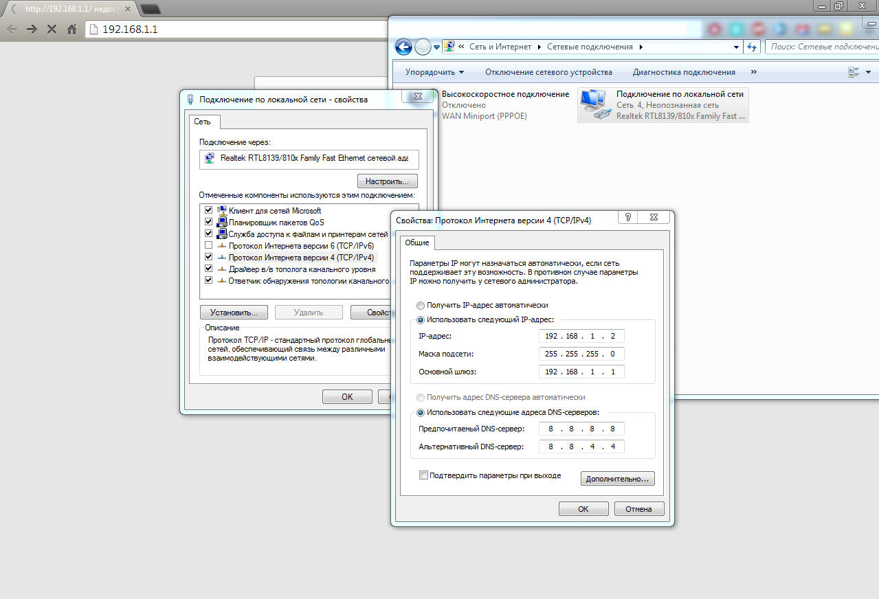 Профиль | Отправить PM | Цитировать Итак суть проблемы: не удается подключиться к 192.168.1.1, попытался решить это следующим путем: прописал IP;шлюз вручную - но это не дало никаких результатов, сеть осталась неопознанной
