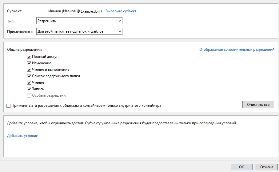 Профиль | Отправить PM | Цитировать ko4evneg, Вы правы, это помогло с пользователем иванов. но чтобы все поля стали разрешенными в действующих правах доступа нужно было поставить галку не только "Сhange" но и "Full Control". Но действующие разрешения группы по прежнему все запрещены, хотя дан полный доступ. В чем дело может быть?
