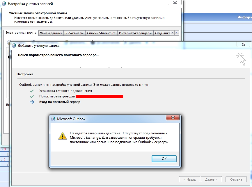 Выручайте! Перерыл весь Инэт, ничего толкового не нашел. Суть проблемы: установил на сервер под 2008r2 Exchange 2013. Все замечательно установилось, работало великолепно. В один "прекрасный день" неожиданно слетает активация на Windows. После переактивации (ключи лицензионные, все как положено) перестало работать подключение к Exchange через Outlook. OWA и мобильные устройства так же работают, как и прежде. Через Панель управления-->Почта-->Учетные записи Autodiscover отрабатывает как положено. Скрин ошибки приведен ниже. P.S. в Exchange новичок, так что не судите строго. |