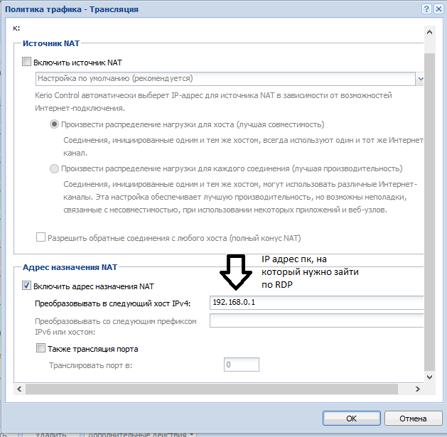 Профиль | Отправить PM | Цитировать В Керио нужно настроить правило с перенаправлением на ip сервера, если подключение по rdp
